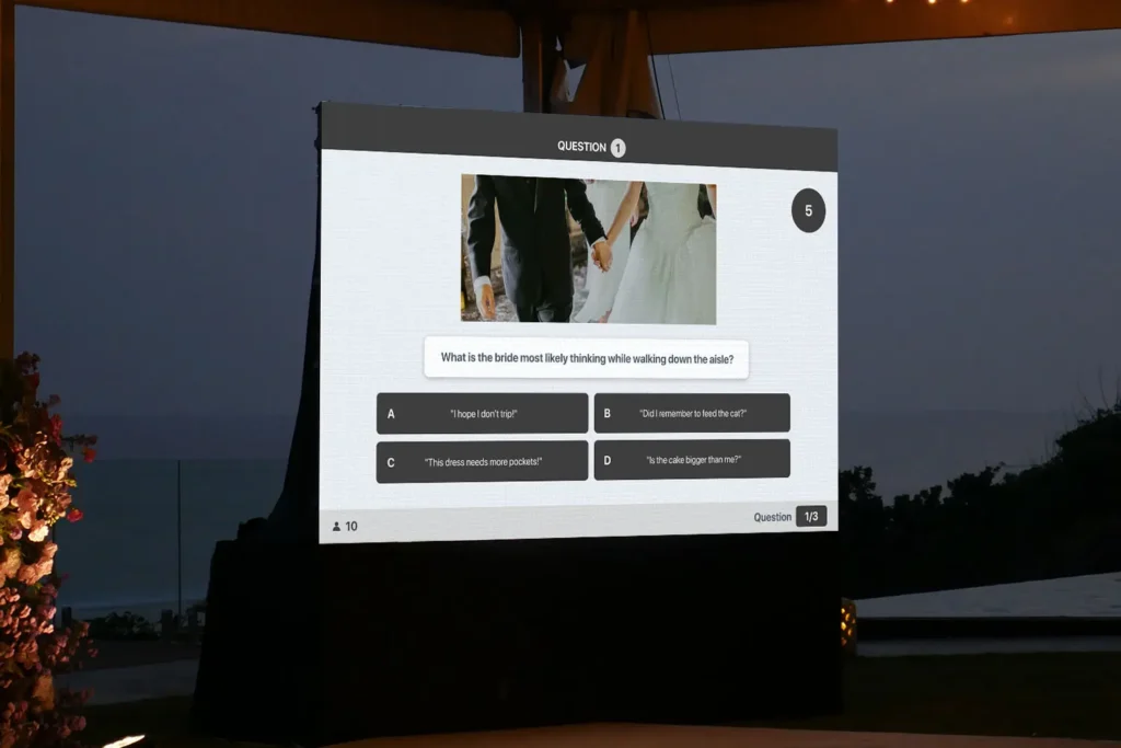 Want to infuse your wedding reception with energy and connection? WedScreen’s interactive games offer delightful ways to engage your guests and create shared memories. Envision loved ones laughing together over personalized quizzes that reveal fun facts about your relationship, sparking conversations and friendly banter. Or picture the excitement of a photo scavenger hunt, prompting guests to explore the venue and capture unique moments through their own lenses.